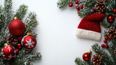 A decorative layout featuring red ornaments pine branches and pinecones perfect for the winter holiday season backdrop.