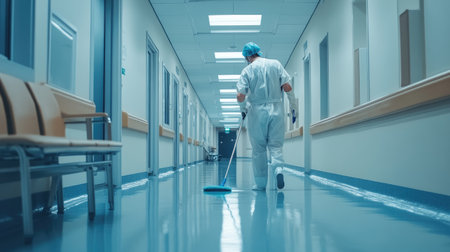 A janitor cleaning the floor of a hospital hallway with a mop, wearing protective clothing and gloves