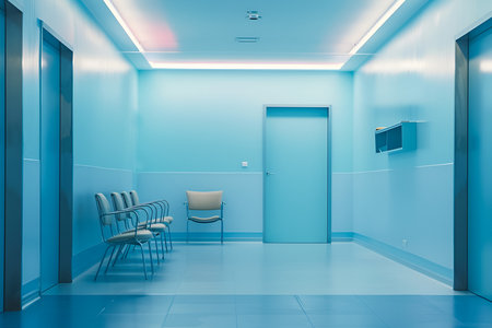 Interior of a hospital corridor with blue lights. 3D rendering