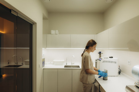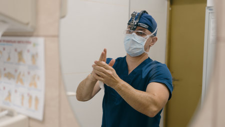 Serious male dentist wearing surgical mask and gloves, preparing for a dental procedure in a clean, sterile environment