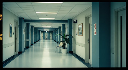 Empty Hospital Corridor with Fluorescent Lighting and Closed Doors