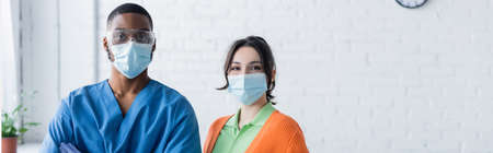 young woman and african american physician in medical masks looking at camera, vaccination concept, banner