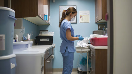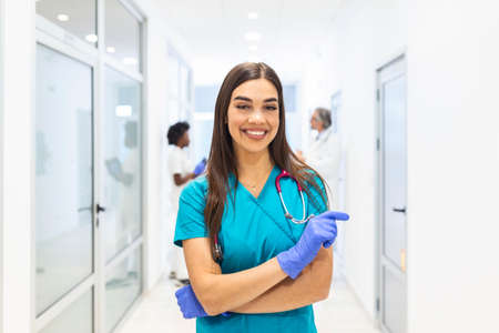 Female doctor in scrubs and gloves working in hospital ward. Medical healthcare and doctor staff service.
