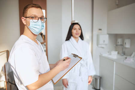 Mature male patient describing his symptoms to young physician in uniform and protective mask making notes in document