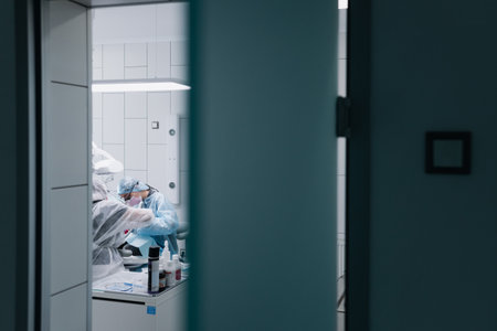 Healthcare professionals adjusting personal protective equipment before entering a high risk infection room, demonstrating safety protocols in a hospital setting