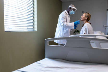 African american male doctor wearing face mask giving covid swab test to female patient. medicine, health and healthcare services during coronavirus covid 19 pandemic.