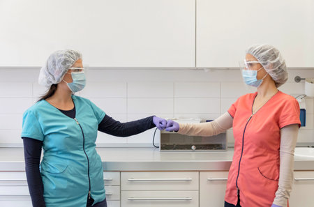 Two medical workers greeting with fist bump. Hospital, nurse, doctor, surgical mask, gloves, protective equipment.
