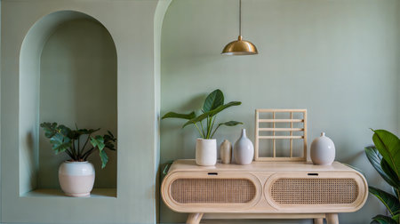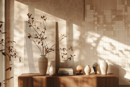 A sophisticated minimalist interior design featuring a light wood console with elegant decorative accents, including a woven basket and vases. Sunlight filters through the space, casting soft shadows that enhance the warm tones and clean lines. The overall atmosphere is one of tranquility and natural beauty.