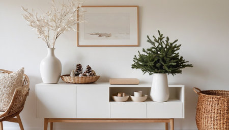 Interior of living room with white chest of drawers, Christmas treerations and plants