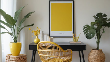 Interior of modern living room with mock up poster frame, rattan chair, table and plant
