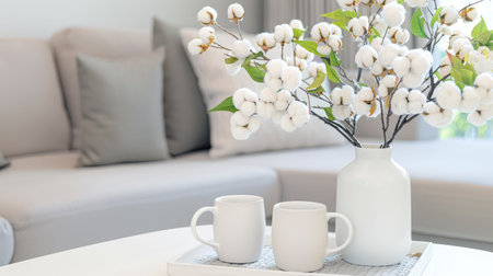 A beautifully designed living room featuring a cozy seating area with soft furnishings, a white vase with cotton flowers, and minimalist mugs on a tray.