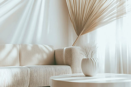 Elegant minimalist living room with decorative flowers and soft lighting during daytime