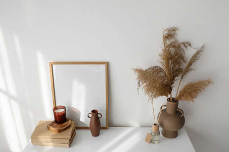 Vase with dry reed, photo frame, books and decor on table in light room