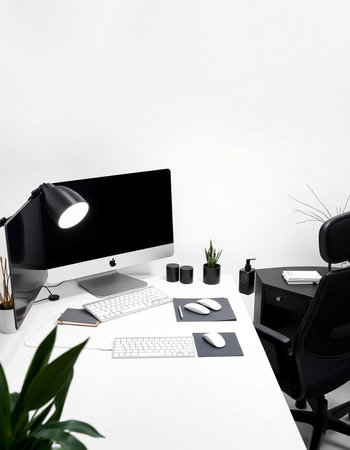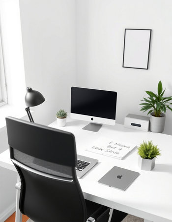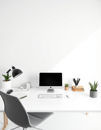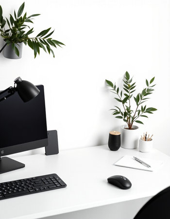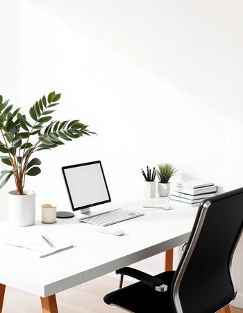 workplace with computer and plant on white table, modern office interior