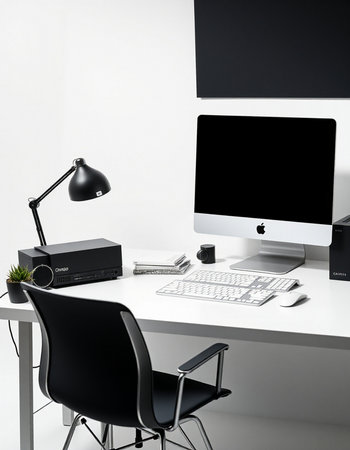Workplace with computer and black chair on white table in modern office