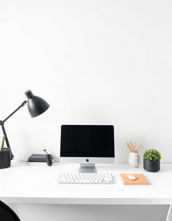 Minimalist workplace with computer, supplies and copy space on white wall