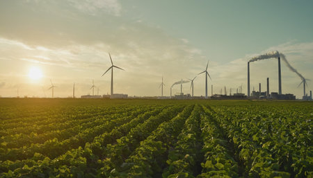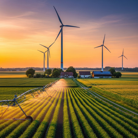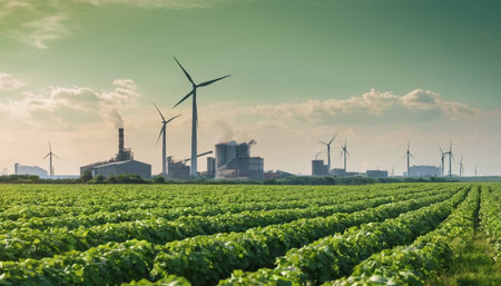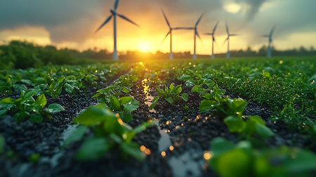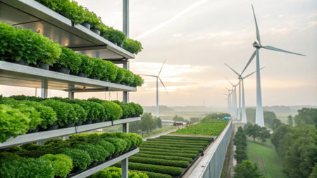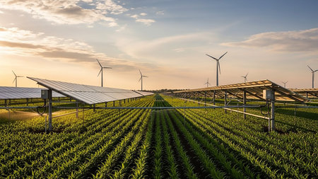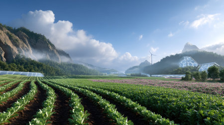 Sustainable agriculture landscape. Green fields and renewable energy. Farming and clean power.