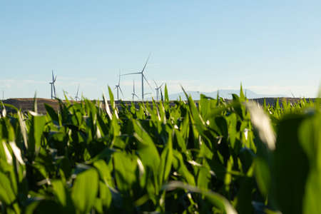 New wind turbines, recently installed in the municipal area of the town of Gallur, rotate with the wind over the corn fields in summer, community of Aragon, Spain.