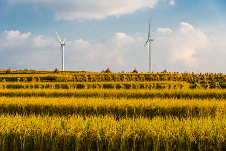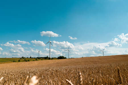 Scenic landscape view of wheat field harvest and big modern wind turbine mill farm against beautiful clouds blue sky. Food production and clean green renewable sustainable energy generation concept