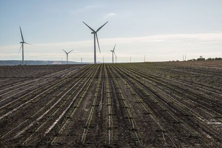 Wind turbines in the field. Eco-energy concept.