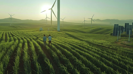 Renewable energy landscape with wind turbines, solar panels, and green fields Two people walking together in a sustainable environment at sunset, highlighting eco friendliness and harmony