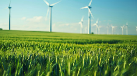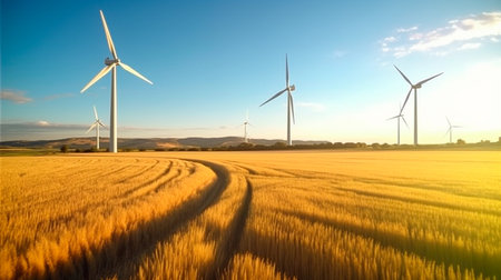 Contemporary wind turbines in sunny wheat field, blending renewable energy with agriculture