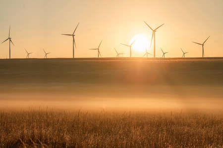 Wind turbines farm at sunset in Limon, Colorado.
