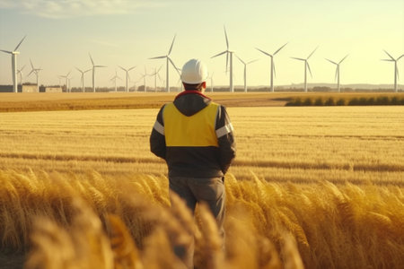Worker in a wheat field with wind turbines in the background with Generative AI.