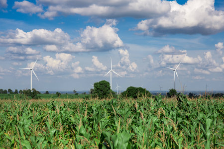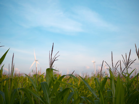 Corn field with blue sky and blurred wind turbine