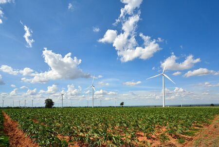 Wind Turbine for alternative energy on background sky on Cassava plantation