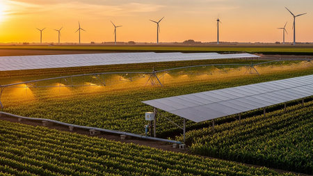 A vast agricultural field at sunset features rows of solar panels, wind turbines on the horizon, and an irrigation system spraying water over crops.