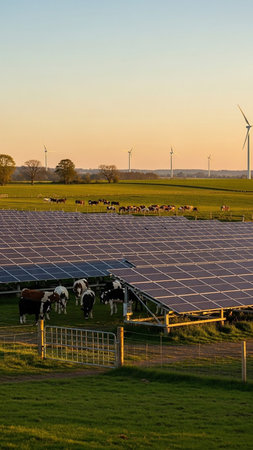 Cows graze on a green field in front of a large solar panel array and distant wind turbines under a warm sunset sky. The scene blends agriculture and renewable energy.