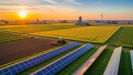 An aerial perspective captures a farm at sunset, showcasing solar panels, a tractor working in fields, and a wind turbine against a warm, golden sky.