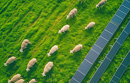 An aerial view of a lush grass field with sheep munching and solar panels. substitute energy source.