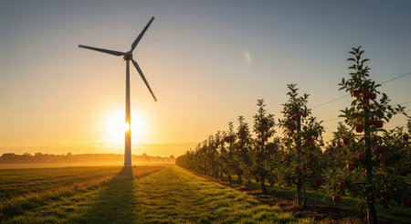 Wind turbines in an apple orchard at sunrise, in the Netherlands