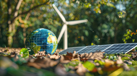 Clean energy concept for World Environment Day: Earth globe, solar panels, and windmill against a natural backdrop, symbolizing sustainable development and renewable resources