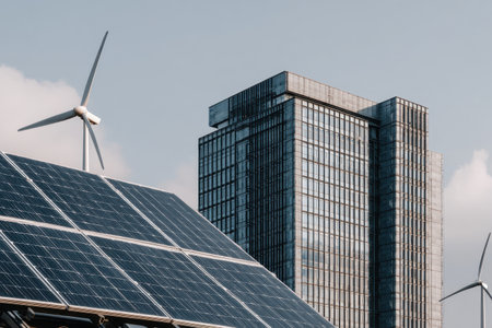 Explore a close-up view of sustainable urban infrastructure showcasing solar panels and wind turbines against a modern skyline, emphasizing eco-friendly energy solutions.