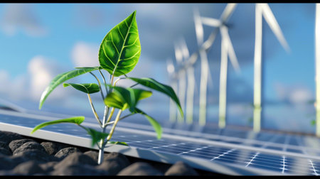 A close-up shot of a green plant sprouting from a solar panel, with wind turbines visible in the background, symbolizing renewable energy and sustainability.