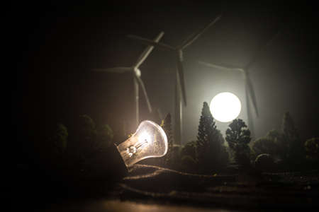 Electricity power in nature or clean energy concept. Wind Turbine producing alternative energy at night. Glowing bulb powered by alternative energy. Creative decoration with small miniature. Selective focus