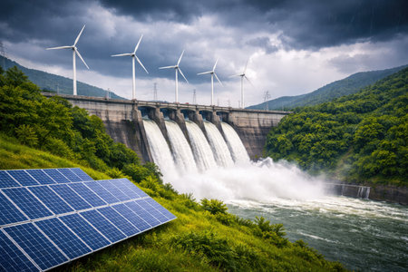 Sustainable Power Generation Combining Hydroelectric Dam Solar Panels and Wind Turbines