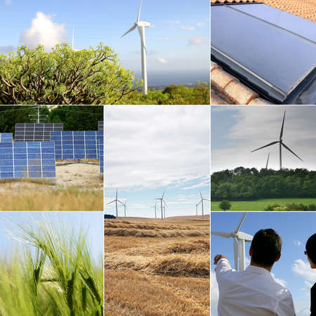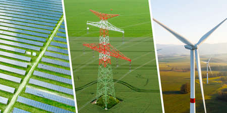 Renewable green energy collage with solar panel, windmill and pylon. Generation of electricity and power.