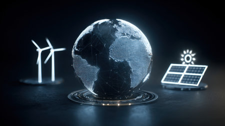Digital globe representing renewable energy sources, featuring wind turbines, solar panels, and glowing Earth. This symbolizes sustainability and innovation in energy
