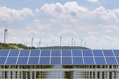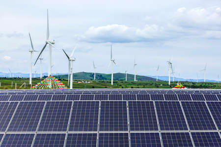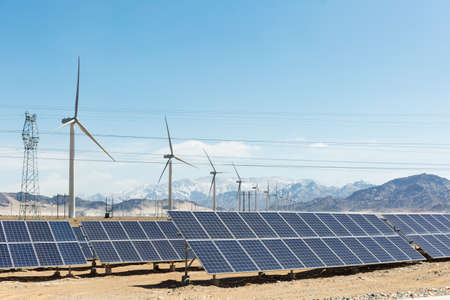 Solar panels and wind turbines in a solar power plant, alternative electricity source