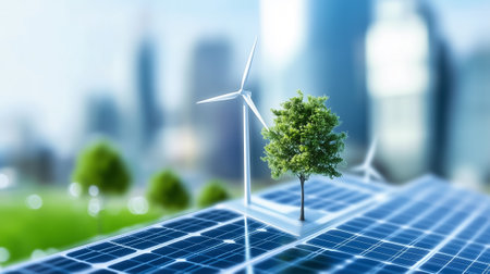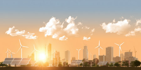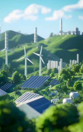 The landscape showcases eco-friendly architecture, solar panels, wind turbines, and urban greenery for clean energy.