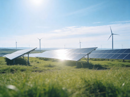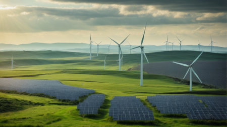 coexistence of wind and solar energy. Wind turbines and solar panels in a green landscape, demonstrating the potential of sustainable collaboration for a cleaner future