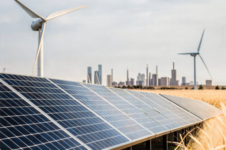 Solar panels and wind turbines in a field with a city skyline in the background. Clean energy concept.