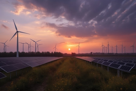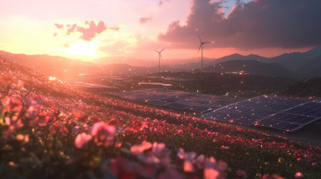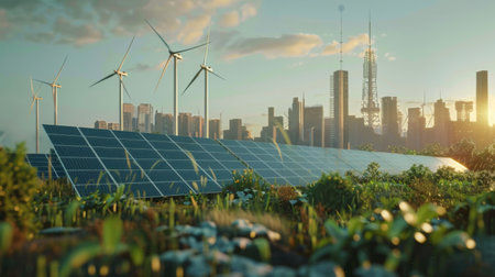 A captivating depiction of a sustainable energy environment featuring wind turbines and solar panels, illustrating the future of clean and renewable energy solutions.