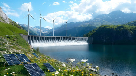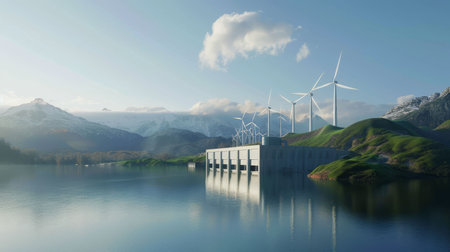 Stunning panoramic view of a sustainable energy landscape featuring wind turbines,solar panels,and a hydroelectric dam nestled amidst the majestic mountains and serene lake.
