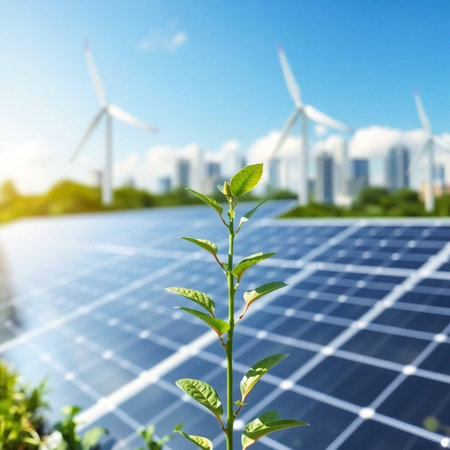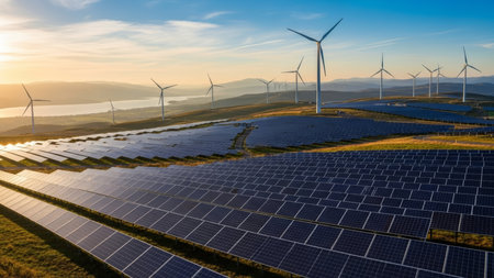 A vibrant landscape featuring wind turbines and solar panels, showcasing a sustainable future in harmony with nature.