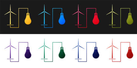 Set Wind mill turbine generating power energy and bulb icon isolated on black and white background. Natural renewable energy production using wind mills. Vector